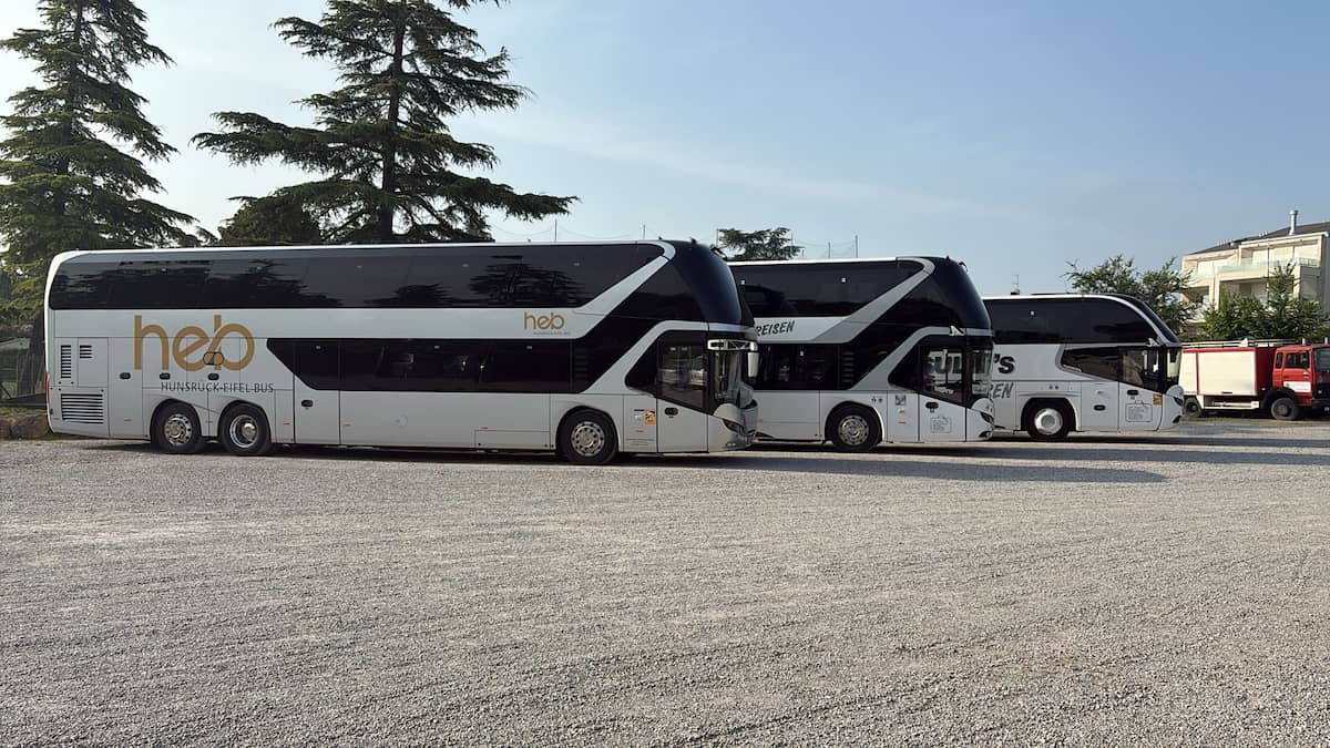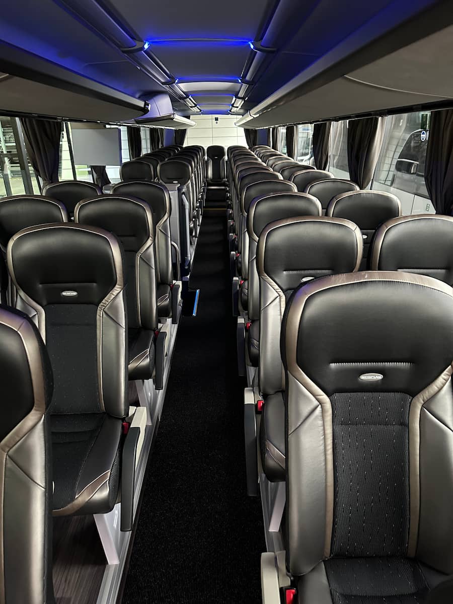 Folgende Ausstattungspunkte sind in allen Reisebussen vorhanden: Fernreiseschlafsessel mit Fußrasten | Klapptischen und Armlehnen | Leselampen für jeden Sitzplatz | Bordküche | Mind. ein Kühlschrank | Bord DVD mit Flachbildschirmen | HiFi-Anlage (Radio, CD, MP3, Mikrofonanlage) | Navigationssystem | Klimaanlage mit Einzelplatzeinstellung | WC | Umweltfreundlich – Euro VI | Neuste & modernste Sicherheitstechnik | Brandmeldeanlage | 230V Steckdosen | z.T. USB-Steckdosen